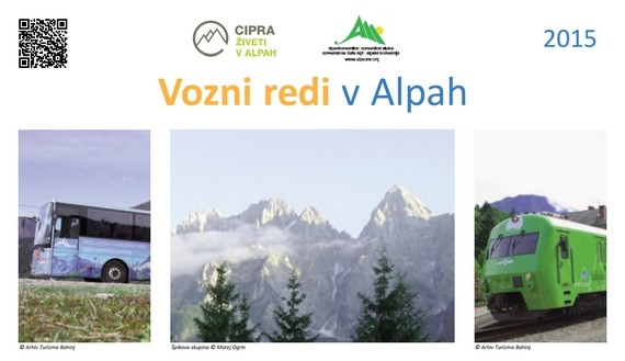 sreda, 27. maj 2015 ob 11:45, ogledov: 19054 Vozni redi v Alpah 2015Objavil(a): Matej Ogorevc | | Pred vami je sedma izdaja knjižice, ki ponuja pregled voznih redov slovenskih železnic, avtobusov, lokalnih prevoznikov in izposoje koles na območju slovenskih Alp in delom avstrijske Koroške. Želja po spodbujanju trajnostne mobilnosti je v Sloveniji vedno večja in zavedanje, da uporaba javnega potniškega prometa prispeva k bolj čistemu okolju, navdaja z optimizmom in daje motivacijo, da postanemo del sprememb. | Tovorni in potniški promet sta pomembna dejavnika podnebnih sprememb, tudi v Alpah, ki so območje pomembnih prometnih
