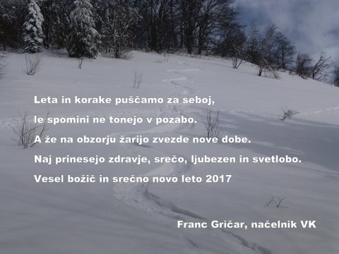 | NOVICE četrtek, 22. december 2016 ob 00:00, ogledov: 3625 Voščilo Vodniške komisije PZS| Objavil(a): Matej Ogorevc |  |  | Vodniška komisija PZS, Strokovni odbor za kategorizacijo in registracijo, Strokovni odbor za usposabljanje, strokovna sodelavka Veronika ter Izvršni odbor z načelnikom na čelu, vam vsem želimo mirne, vesele in prijetnih gorskih trenutkov polne božično-novoletne praznike! |  |  |