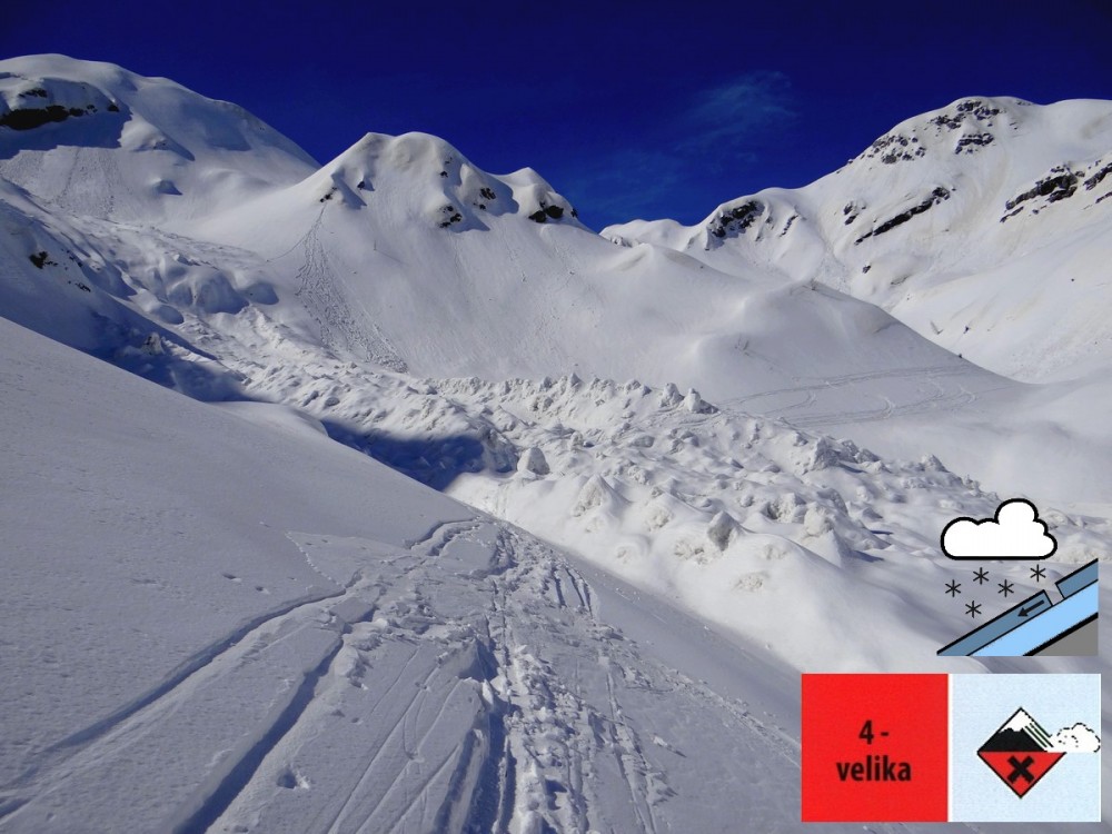 Nevarnost snežnih plazov je trenutno nad nadmorsko višino okoli 1400 m velika, 4. stopnje, nižje pa znatna, 2. stopnje. |