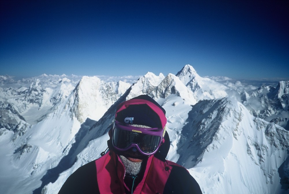 Iztok Tomazin na vrhu Gašerbruma 1 (8068 m), zadaj od leve proti desni Mustagh Tower, Gašerbrum 4, Broad Peak, Gašerbrum 2 in K2 (foto Marko Čar)
