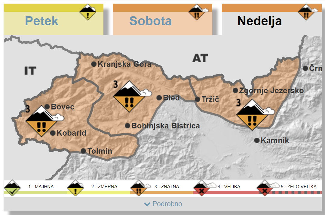 četrtek, 4. april 2024 ob 11:50, ogledov: 3098 Zaradi odjuge se bo iz dneva v dan povečevala nevarnost proženja snežnih plazov| Objavil(a): Manca Ogrin | | Ob izraziti suhi otoplitvi se bo najbolj povečala nevarnost proženja snežnih plazov na prisojnih pobočjih, kjer se bo tekom dneva zaradi sonca sneg ojužil vse do najvišjih vrhov. Tam se bodo predvsem na strmih pobočjih lahko prožili plazovi mokrega nesprijetega snega. Mehčanje površine snežne odeje bo zaradi velike vsebnosti puščavskega peska še nekoliko hitrejše kot običajno ob povsem belem snegu, v plazovnem biltenu opozarjajo na Agenciji republike Slovenije za okolje (ARSO). | Opis stanja in napoved (četrtek, 4. 4. 2024)