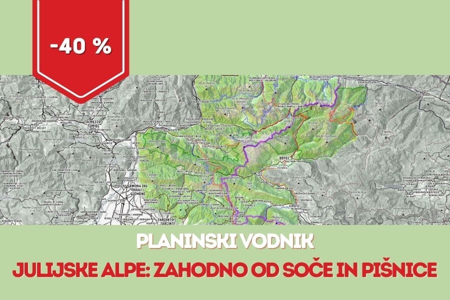ponedeljek, 1. september 2025 ob 18:15, ogledov: 424 Vodnik meseca | Julijske Alpe: Zahodno od Soče in Pišnice| Objavil(a): Matej Ogorevc | | Septembra po znižani ceni ponujamo planinski vodnik Julijske Alpe: Zahodno od Soče in Pišnice. Pripravila sta ga Klemen Janša in Jože Drab in je do konca meseca septembra na voljo s 40-odstotnim popustom. Namesto 31,90 za 19,14 €! | Povabljeni ste na planinske poti, ki vodijo na 45 čudovitih planinskih ciljev, posejanih v zahodnem delu Triglavskega narodnega parka in zamejskih Zahodnih Julijcih. Točneje, gre za območje gorskih skupin Jalovca, Mangarta, Bavškega Grintavca, Viša, Montaža, Kanina in Julijskih Predalp.